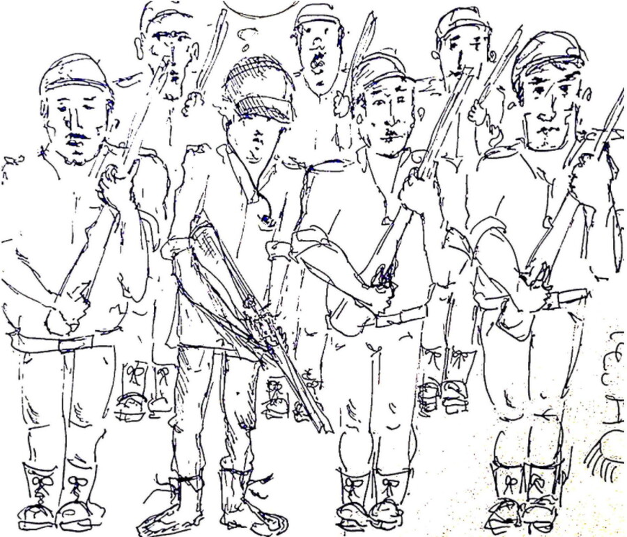Das Bild, das ich gezeichnet habe, zeigt Baltazar bei einem Appel der Militärdienstleistenden. Baltazar steht in der ersten Reihe als zweiter von links. Ich habe versucht, die Figur seinem Aussehen nachzuempfinden und äußerliche Merkmale wiederzugeben, aber noch mehr habe ich mich beim Zeichnen auf die Wiedergabe der Unterschiede zwischen ihm und den anderen Wehrdienstleistenden konzentriert. In der Situation, die Baltazar mir beschrieb, hörte er während des Appells verbotene Musik über seinen MP3-Player. Es ist zu sehen, dass er Kopfhörer im Ohr hat, deren Kabel aus seiner Hemdtasche ragen, er verbirgt also nicht, dass er seine Aufmerksamkeit etwas anderem zuwendet, als er soll, was sich mit Goffman (2009 [1963], 65ff.) als fehlendes »Kernengagement« bezeichnen ließe. Man erkennt ihn auch daran, dass er im Gegensatz zu den anderen exerzierenden, strammstehenden Soldaten das Gewähr nicht ordentlich in der Hand hält – aufrecht, wie es bei der Parade gefordert wird. Seine Schuhe sind nicht zugebunden und die Schnürsenkel hängen unordentlich herab. Auch trägt er seine Kappe tief ins Gesicht gezogen.