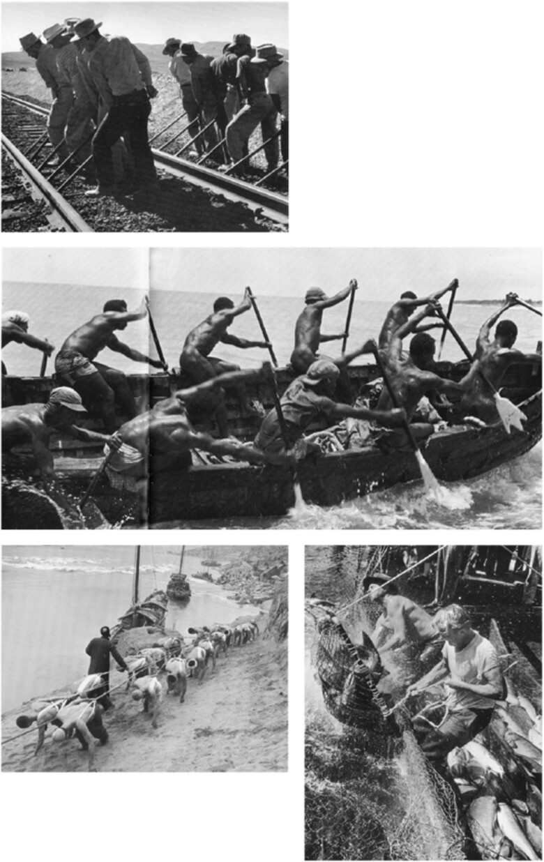Eine etwas anders gelagerte, strukturell aber vergleichbare Strategie liegt der Montage von Bildern zu ikonischen Bildclustern3 zugrunde. Hier wird das Sehen im Freiraum des Bildmöglichen durch Redundanzen und Wiederholungen auf ein bestimmtes Bildverständnis hingelenkt. »Die Nachbarbilder«, so bringt es Felix Thürlemann auf den Punkt, »zeigen dem Betrachter, wie er ein bestimmtes Bild sehen soll« (Thürlemann 2013, 20). Edward Steichen etwa tauchte die von ihm aufgegriffenen Alltagsszenen in seiner Ausstellung The Family of Man (Abb. 6a–c) nicht nur in ein von allen Gerüchen, Geräuschen und Farben bereinigtes fotografisches Schwarzweiß. Durch die Art und Weise der Zusammenstellung seiner Fotografien erzeugte er zugleich auch eine sich symbolisch verdichtende Ähnlichkeitsbeziehung zwischen diesen Fotografien. Arbeit kann in diesen Bildgefügen kaum anders gesehen werden als »männlich, körperlich und kollektiv«, Liebe kaum anders als »zweigeschlechtlich, romantisch und keusch«.