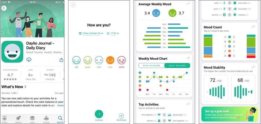 »Daylio Journal & Diary is a very versatile app, and you can turn it in whatever you need to track. Your fitness goal pal. Your mental health coach. Your gratitude diary. Mood tracker. Your photo food log. Exercise, meditate, eat, and be grateful. Take care of your mental, emotional, and physical health. Good self-care is a key to improved mood and reduced anxiety.«16